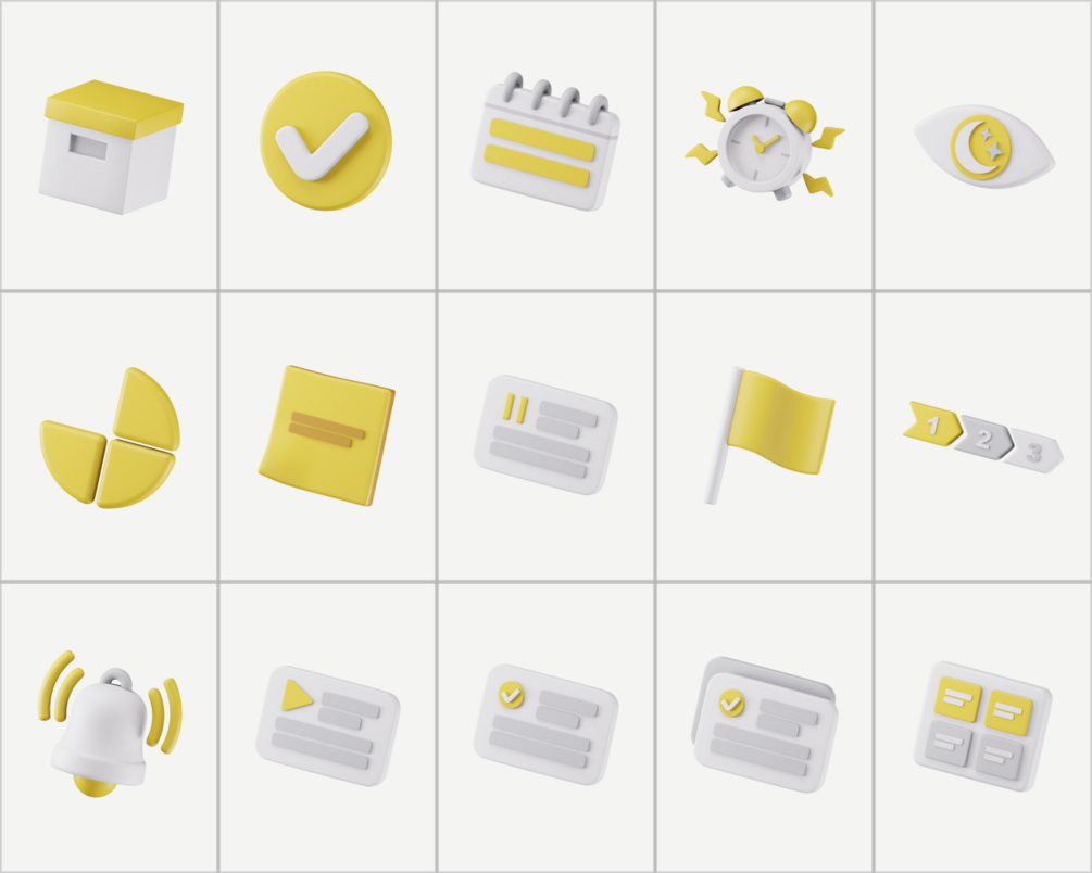 This pack focuses on Productivity & Task Flow commonly used in product interfaces, making it perfect for designers who need consistent and ready-to-use 3D icons.
